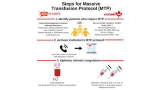 El documento resume la historia de la transfusión sanguínea, los tipos de sangre y componentes sanguíneos, los requisitos para donar sangre, y las indicaciones y dosis para transfusiones. Explica los tipos de sangre (A, B, AB, O) y factores (Rh+, Rh-), y los componentes como paquete globular, plaquetas, y plasma. Describe los estudios necesarios antes de una transfusión y las medidas de seguridad.