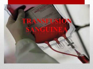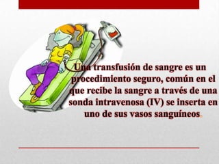 Una transfusión de sangre es un procedimiento seguro y común donde la sangre se inserta en los vasos sanguíneos a través de una sonda intravenosa. Las transfusiones sanguíneas reemplazan rápidamente la capacidad de la sangre para transportar oxígeno y su objetivo depende de la enfermedad del paciente. El procedimiento de transfusión de sangre implica verificar la compatibilidad del grupo sanguíneo, monitorear al paciente durante la transfusión y estar alerta a posibles reacciones adversas.