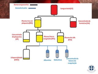 Este documento proporciona información sobre hemoderivados y transfusión. Explica brevemente la historia de las transfusiones, define los diferentes tipos de hemocomponentes como glóbulos rojos, plaquetas, plasma fresco congelado y crioprecipitado. También describe las indicaciones de transfusión, las normas locales y los posibles efectos adversos como las reacciones hemolíticas agudas y tardías. El objetivo es que los lectores conozcan los fundamentos sobre productos sanguíneos y su uso terapéutico.