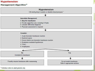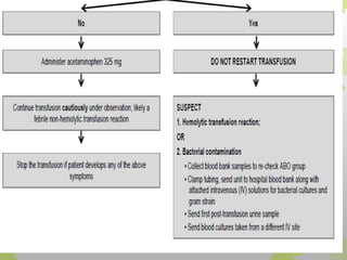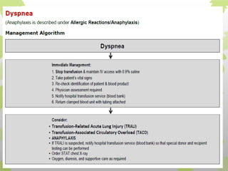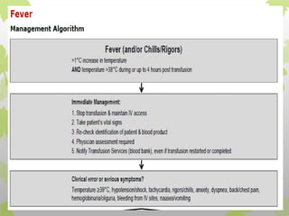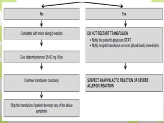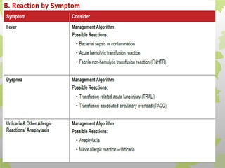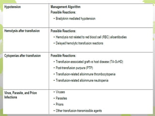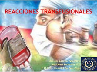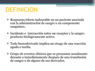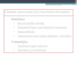 Este documento describe diferentes tipos de reacciones transfusionales. Define reacciones agudas como aquellas que ocurren dentro de las primeras 24 horas, incluyendo reacciones febriles no hemolíticas, alérgicas, lesión pulmonar aguda relacionada con transfusión, y sobrecarga circulatoria. También describe reacciones tardías después de 24 horas, como reacción de injerto contra huésped y púrpura postransfusional. Finalmente, discute enfermedades infecciosas que pueden transmitirse a trav