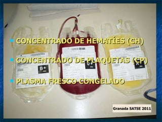 El documento proporciona información sobre transfusiones de concentrado de hematíes, concentrado de plaquetas, plasma fresco congelado, así como complicaciones agudas y crónicas asociadas con las transfusiones. Describe indicaciones, características, dosis y administración de cada componente sanguíneo. También cubre reacciones inmunológicas y no inmunológicas a las transfusiones, así como el tratamiento y manejo de dichas complicaciones.