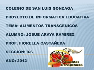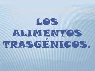Este documento describe los alimentos transgénicos, que son organismos que han sido modificados genéticamente para producir características deseadas mediante la inserción de genes de otras especies. Explica que actualmente hay muchos alimentos procedentes de plantas transgénicas como el maíz y la soja. También discute brevemente la historia de los alimentos transgénicos y las regulaciones sobre su uso.