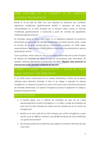 Los transgénicos son organismos vivos cuyos genes han sido manipulados artificialmente. Esto se logra mediante la transferencia de ADN de un organismo a otro. Por ejemplo, el maíz transgénico cultivado en España contiene genes bacterianos que le permiten producir insecticidas. Aunque algunos cultivos transgénicos están autorizados en la UE, no siempre es obligatorio etiquetar los alimentos derivados de animales alimentados con piensos transgénicos.