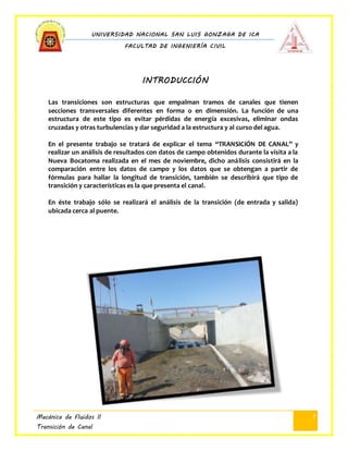 Este documento describe los diferentes tipos de transiciones de canal, incluyendo transiciones biplanas, regladas y alabeadas. Explica cómo calcular las pérdidas de carga en cada tipo de transición y los criterios para determinar la longitud de la transición, como el criterio de J. Hinds de que el ángulo de la superficie del agua sea de 12.5° o 22.5°. Finalmente, presenta datos de campo recolectados durante una visita a una nueva bocatoma, incluyendo medidas de una transición de entrada trapezoidal a cuadrada