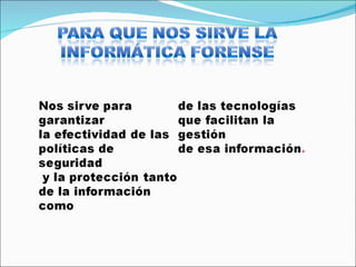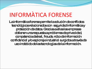 La informática forense permite resolver conflictos relacionados con la seguridad informática y la protección de datos, ayudando a las empresas a responder problemas de privacidad, competencia desleal, fraude y robo de información confidencial. Algunos delitos que detecta son la falsificación de documentos, la lectura no autorizada de información confidencial y el uso no autorizado de programas o acceso a áreas informáticas.