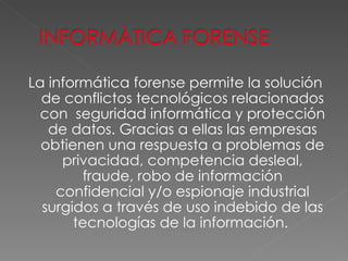 La informática forense permite resolver conflictos relacionados con la seguridad informática y protección de datos, ayudando a empresas a responder problemas de privacidad, competencia desleal, fraude y robo de información a través del uso indebido de tecnologías. La informática forense garantiza la efectividad de políticas de seguridad y protección de información y tecnologías. También ayuda a prevenir falsificación de documentos, lectura no autorizada de información confidencial, uso no permitido de programas y acceso a áreas digitales sin permiso.