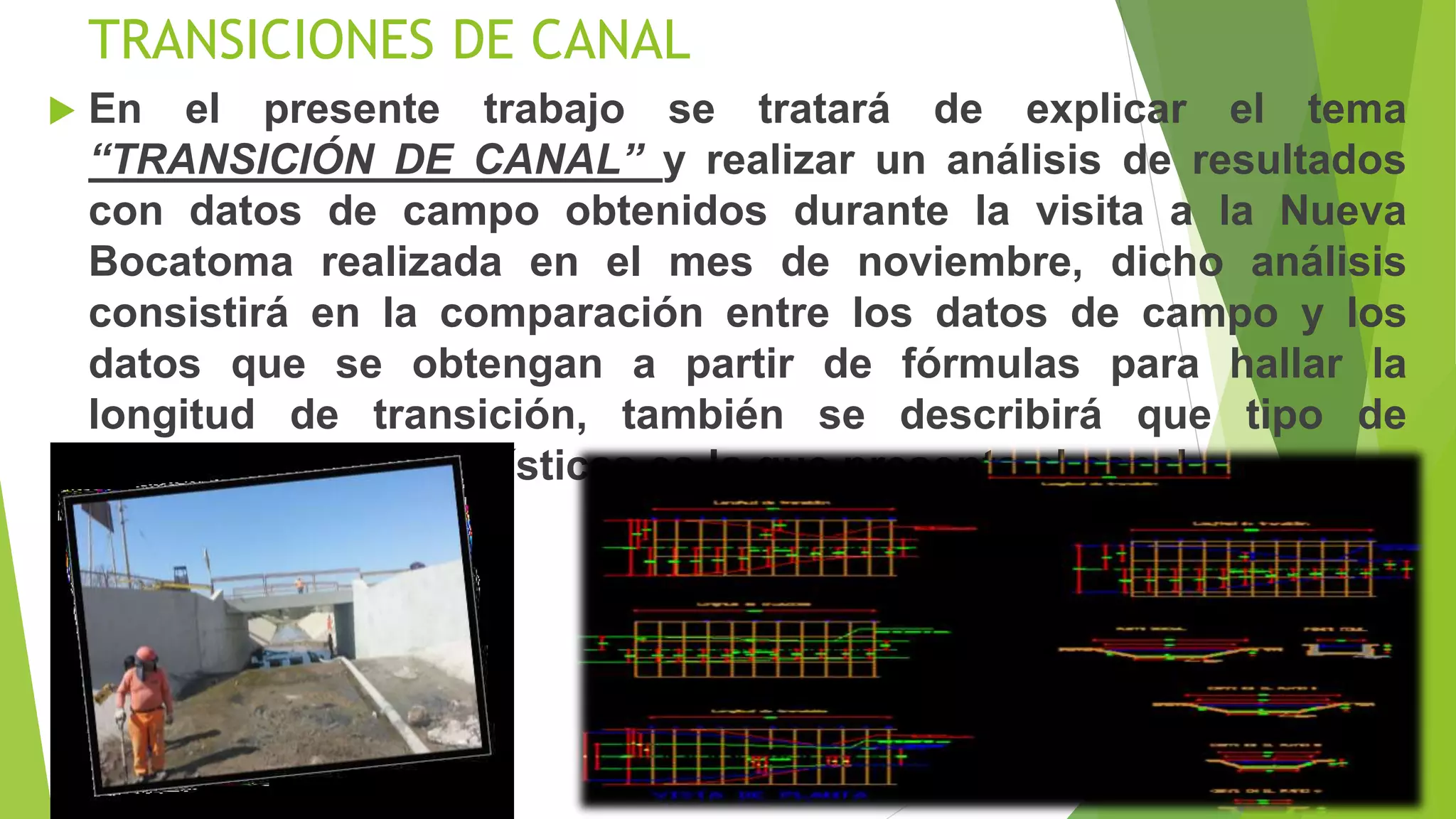 Este documento trata sobre transiciones de canal. Explica que las transiciones se usan en entradas y salidas de acueductos y donde cambia la forma de la sección transversal del canal. Describe dos tipos principales de transiciones: la transición recta formada por líneas rectas y la transición alabeada formada por curvas suaves. Luego presenta cálculos y parámetros hidráulicos para el diseño de una transición recta entre una sección rectangular y otra trapezoidal.