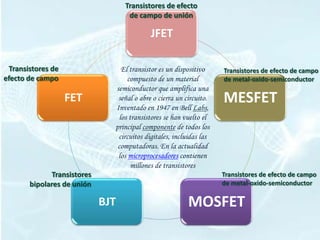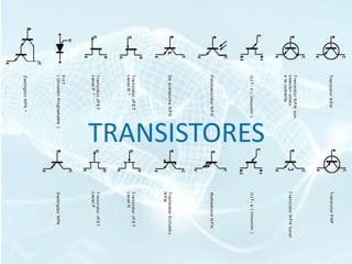 Este documento describe diferentes tipos de transistores, incluyendo transistores bipolares de unión (BJT), transistores de efecto de campo de unión (JFET), transistores de efecto de campo de metal-óxido-semiconductor (MOSFET) y transistores de efecto de campo de metal-semiconductor (MESFET). Explica las características básicas de cada tipo de transistor, como su estructura, funcionamiento y curvas características. También incluye información sobre encapsulados comunes y ejemplos de transistores populares.