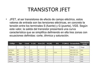 El documento describe diferentes tipos de transistores, incluyendo JFET, MOSFET, PNP, unijuntura y HEMT. Explica que los JFET funcionan mediante la tensión aplicada entre la fuente y la puerta, mientras que los MOSFET se usan comúnmente para amplificar o conmutar señales. Los transistores PNP y de unijuntura también se mencionan brevemente.
