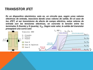 Este documento describe diferentes tipos de transistores, incluyendo el transistor JFET que funciona según la tensión entre sus terminales, el transistor MOSFET que consiste en un sustrato semiconductor con dos islas dopadas separadas por un dieléctrico, el transistor de contacto puntual que fue el primero en obtener ganancia, el transistor de unión bipolar fabricado sobre un monocristal semiconductor con tres zonas dopadas formando dos uniones, y el fototransistor que puede funcionar como un transistor normal o ser controlado por la luz incidente.