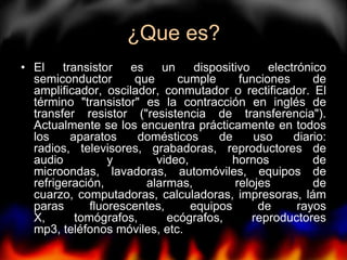 El transistor es un dispositivo semiconductor que se utiliza como amplificador, oscilador, conmutador o rectificador. Existen varios tipos de transistores, incluyendo el transistor de contacto puntual, el primer transistor inventado en 1947, el transistor de unión bipolar fabricado sobre semiconductores como germanio o silicio, y el transistor de efecto de campo como el JFET y MOSFET que controlan la corriente mediante una tensión aplicada a la puerta.