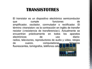Este documento presenta una introducción a los transistores, incluyendo sus tipos principales como transistores de contacto puntual, transistores de unión bipolar (NPN y PNP), transistores de efecto de campo (JFET, MOSFET), y fototransistores. Explica brevemente el funcionamiento y características clave de cada tipo de transistor.