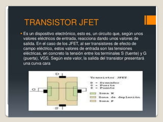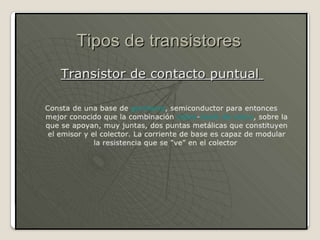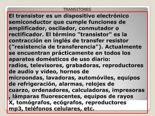El documento habla sobre los transistores, dispositivos electrónicos semiconductores que cumplen funciones como amplificadores u osciladores. Explica que existen diferentes tipos de transistores como los bipolares NPN y PNP, los FET, los MOSFET y los de unión bipolar. También menciona algunas compañías que fabrican accesorios relacionados a los transistores.