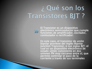 El documento describe el transistor bipolar de unión, el cual consiste en dos uniones PN muy cercanas en un solo cristal semiconductor. Esto forma tres regiones: el emisor, la base y el colector. El transistor controla la corriente que circula entre el emisor y el colector mediante la corriente de base. Los transistores bipolares se usan ampliamente en electrónica analógica y digital.