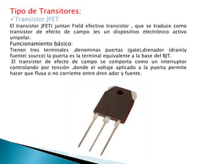 Los transistores son dispositivos semiconductores que se utilizan como amplificadores, osciladores, conmutadores o rectificadores. Existen varios tipos de transistores, incluyendo los transistores JFET, MOSFET, BJT y FET. Los transistores JFET y MOSFET son transistores de efecto de campo controlados por voltaje, mientras que los BJT son transistores bipolares controlados por corriente. Todos estos tipos de transistores se utilizan ampliamente en dispositivos electrónicos modernos como televisores, computadoras y teléfonos cel