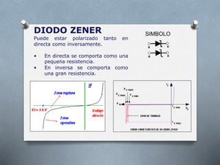 Este documento contiene información sobre varios componentes electrónicos. Explica que el diodo Zener puede polarizarse directa o inversamente, comportándose como una pequeña resistencia o una gran resistencia respectivamente. Describe el transistor de contacto puntual como el primer transistor y cómo funciona, y define al fototransistor como un transistor que puede funcionar de forma normal o como fototransistor cuando la luz incide en él. Finalmente, indica que los disipadores de calor se utilizan para evitar que los transistores bipolares se calienten.