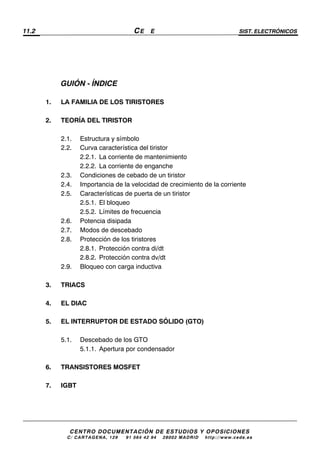 Este documento describe los circuitos electrónicos de potencia utilizados para el control de potencia, incluyendo los dispositivos y elementos empleados, su clasificación, función, tipología y características. Explica los criterios y procedimientos de diseño de estos circuitos, y analiza en detalle la familia de tiristores, su teoría, estructura, curva característica y condiciones de disparo. También cubre otros dispositivos como triacs, diacs, GTO e IGBT.