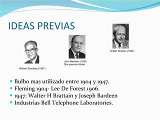 El documento describe el transistor bipolar (BJT), incluyendo su historia, ventajas, parámetros, construcción y regiones de operación. El BJT es un dispositivo de tres terminales (base, colector y emisor) donde la corriente de colector está relacionada con la corriente de base a través de la ganancia del transistor. Funciona en tres regiones principales: zona activa, zona de corte y zona de saturación.