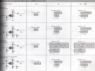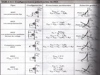 Este documento proporciona información sobre transistores de efecto de campo (FET). Explica las diferencias entre los FET de canal N y P, así como entre los JFET y los MOSFET. También describe las regiones de operación de los FET, sus configuraciones básicas y parámetros. Finalmente, analiza aplicaciones comunes de los FET y cómo detectar fallas en ellos.
