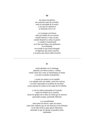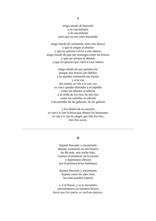 Este poema expresa los miedos y anhelos del yo poético en una relación amorosa. Teme perder a la persona amada o que esta lo abandone. Sin embargo, también desea poder abrazarla y curar sus heridas. Se siente reconfortado y en paz cuando está entre sus brazos. Finalmente, expresa su dependencia emocional hacia la otra persona y el consuelo que encuentra en su compañía.
