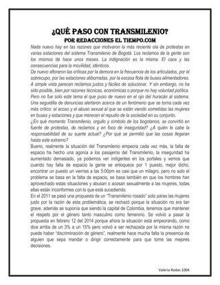 Transmilenio, el sistema de transporte masivo de Bogotá, se ha visto sumido en el caos y la inseguridad debido a la falta de capacidad, frecuencias insuficientes y acoso sexual. Las protestas se han repetido por sobrecupo y retrasos, empeorando la situación. Además, las denuncias de abuso a mujeres en estaciones y buses son cada vez más frecuentes. Se necesitan medidas urgentes para recuperar la autoridad sobre el sistema y garantizar la seguridad de los pasajeros.