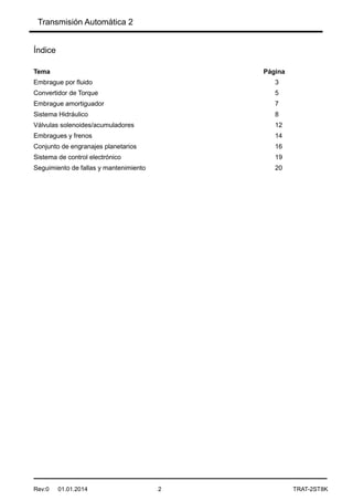 El documento describe los componentes principales de una transmisión automática, incluyendo el embrague por fluido, convertidor de torque, embrague amortiguador, sistema hidráulico y sus válvulas, embragues y frenos, conjunto de engranajes planetarios y el sistema de control electrónico. Explica cómo cada parte funciona y cómo interactúan para permitir el cambio de velocidades en un vehículo automático.