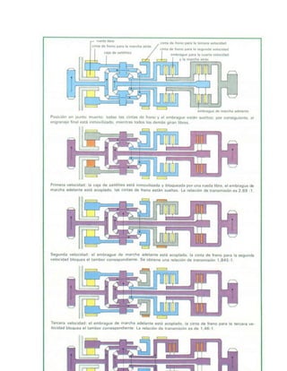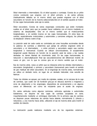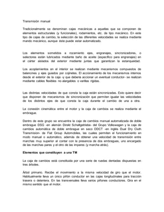 Una transmisión manual tradicionalmente consta de elementos mecánicos como árboles, engranajes y sincronizadores lubricados con aceite. Las distintas velocidades se seleccionan mediante una palanca de cambios que acciona mecanismos internos. Las transmisiones automáticas modernas utilizan convertidores de par y engranajes planetarios accionados hidráulicamente para cambiar automáticamente entre velocidades y ofrecer una conducción más suave.