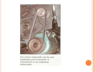 Este documento describe diferentes mecanismos y máquinas de transmisión, incluyendo engranajes, correas, cadenas, tornillos sin fin, trenes de mecanismos, piñones cremallera, husillos tuerca, bielas manivelas, excéntricas, cigüeñales y levas y seguidores. Explica cómo estos mecanismos transmiten y transforman movimiento entre componentes de una máquina.