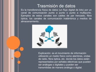 La transmisión de datos es la transferencia física de datos digitales a través de un canal de comunicación como cables, fibra óptica o ondas de radio. Los datos se representan mediante señales eléctricas analógicas o digitales y pueden transmitirse de forma analógica o digital. Existen métodos para detectar y corregir errores durante la transmisión causados por ruido. La compresión de datos reduce el volumen de datos representando la información en un espacio menor.