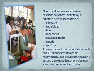 El documento discute la complejidad de educar en valores en la sociedad actual. En 3 oraciones o menos, resume que la educación en valores enfrenta desafíos debido a los cambios sociales y la pérdida de valores tradicionales, pero que es posible educar en valores a través de un enfoque integral que involucre conocimientos, habilidades de reflexión y significado personal para los estudiantes.