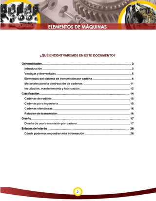 Este documento proporciona información sobre los sistemas de transmisión por cadena. Explica que estos sistemas transmiten movimiento entre dos ejes paralelos distantes y están compuestos por una cadena formada por eslabones rígidos unidos y dos ruedas dentadas. También describe los componentes de la cadena y las ruedas dentadas, los mecanismos de tensión, los materiales comunes, y los procesos de instalación, mantenimiento y lubricación. Además, clasifica los diferentes tipos de cadenas y explica conceptos como la rel