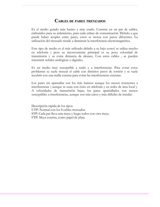 Este documento describe y compara varios medios de transmisión de datos, incluyendo cable coaxial, cable de pares trenzados, fibra óptica, microondas, infrarrojo y satélite. Explica que el cable coaxial permite mayores velocidades de transmisión y distancias que el cable de pares, pero es más caro. La fibra óptica ofrece las mayores velocidades, distancias, seguridad y ancho de banda, mientras que las microondas y satélites permiten la transmisión inalámbrica de larga dist