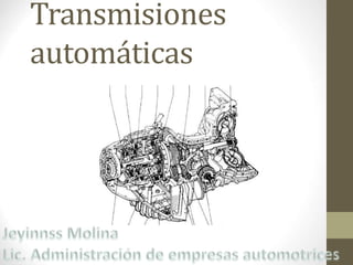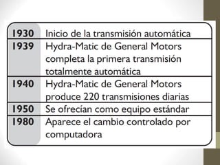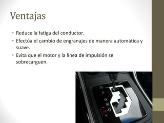 Las transmisiones automáticas reducen la fatiga del conductor al realizar los cambios de forma automática y suave, evitando sobrecargar el motor. Se desarrollaron en los años 30 pero no se popularizaron hasta los 40, cuando Ford las incorporó a su modelo T. Utilizan trenes epicicloidales y embragues/frenos hidráulicos para seleccionar las marchas mediante la palanca de cambios o de forma automática, proporcionando cambios suaves.