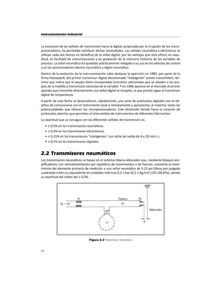 Este documento describe diferentes tipos de transmisores, incluyendo neumáticos, electrónicos, digitales e inteligentes. Explica cómo cada tipo convierte la señal de proceso en una señal de salida como neumática, eléctrica o digital, y cómo la precisión ha mejorado con el tiempo desde ±0,5% hasta ±0,1% con los transmisores digitales. También describe las ventajas e inconvenientes de cada tipo y cómo los transmisores inteligentes ofrecen funciones adicionales gracias a los microprocesadores.