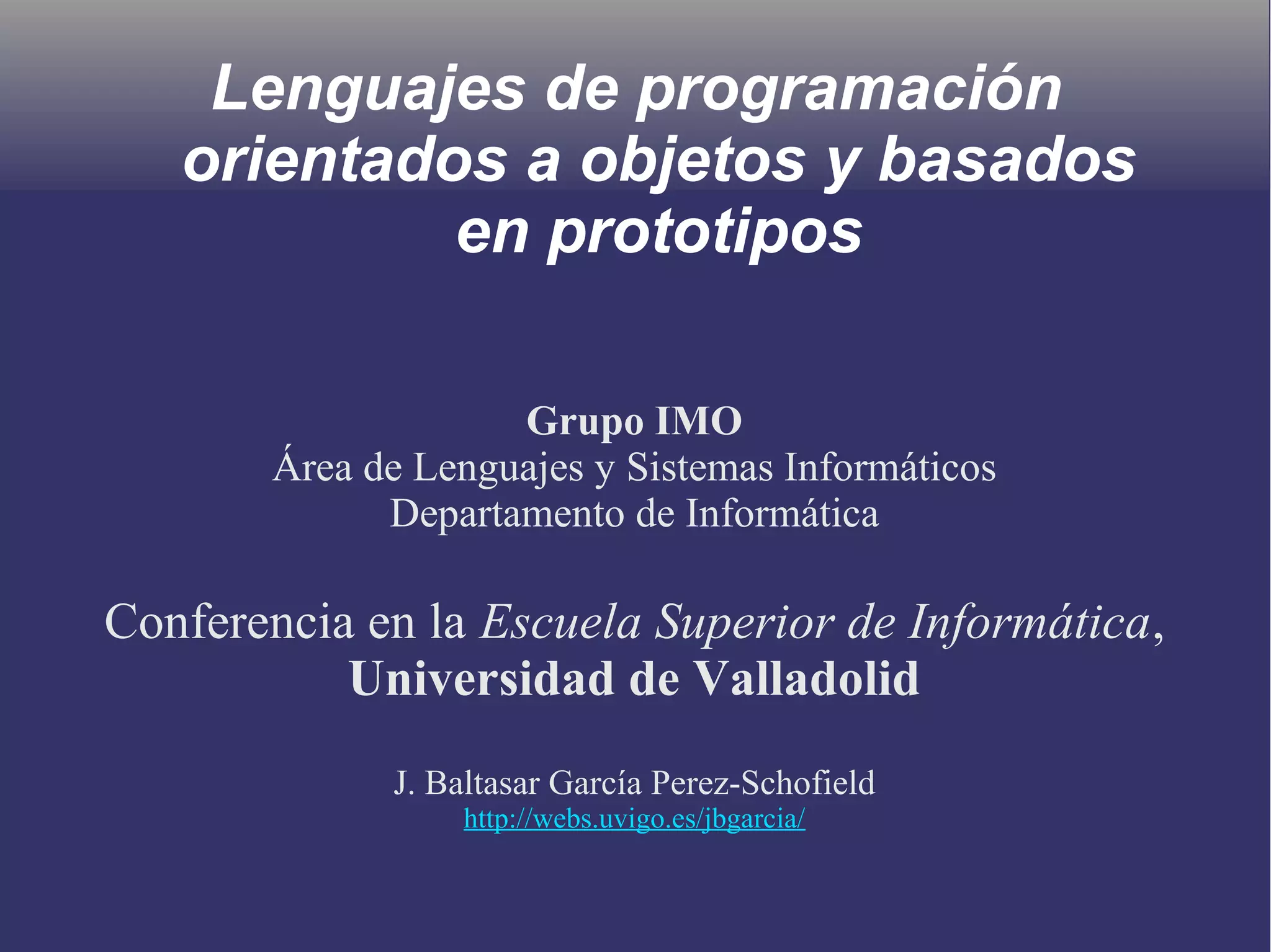 El documento explora las diferencias entre lenguajes de programación orientados a objetos basados en clases y los basados en prototipos, destacando características fundamentales como la creación de objetos, la herencia y la flexibilidad de los prototipos. Se discuten ejemplos de lenguajes prototípicos como Self, Io, y Python, y se mencionan ventajas y desventajas de su uso en comparación con modelos basados en clases. Finalmente, se presentan conclusiones sobre la aplicabilidad y los contextos en los que los lenguajes basados en prototipos son más efectivos.
