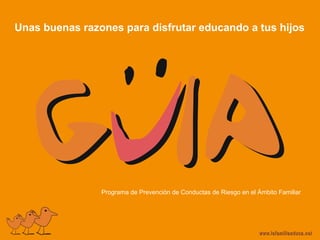 Este documento trata sobre el programa de prevención de conductas de riesgo en el ámbito familiar. Ofrece consejos sobre el rol de los padres, el establecimiento de normas, hacer pactos con los hijos, la educación en emociones y hábitos alimentarios saludables. Recomienda que los padres ejerzan su autoridad de una manera comprensiva mientras establecen normas y consecuencias claras y enseñan a los hijos habilidades como el autocontrol y la aceptación de sentimientos.