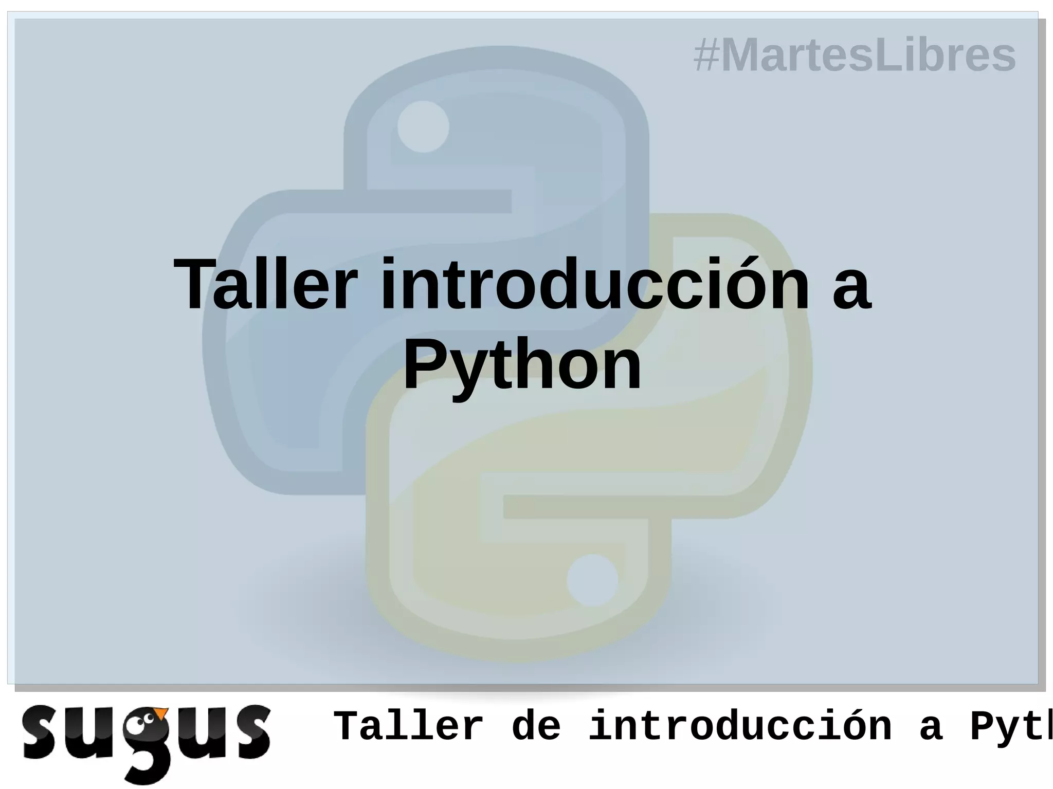 El documento presenta un taller de introducción a Python. Incluye información sobre la historia del lenguaje, características como tipos de datos y sintaxis, módulos útiles como PyGame y OpenCV, y herramientas como PEP 8 y RunSnakeRun. El taller cubre conceptos básicos de Python y ejemplos prácticos de su uso.