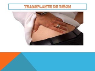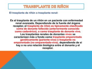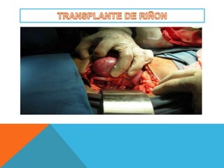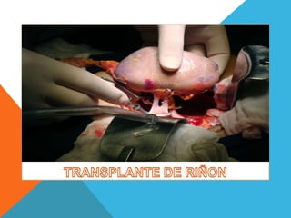 El documento describe el proceso de trasplante de riñón. Existen dos tipos principales de trasplantes de riñón: de donante vivo o de donante fallecido. Los primeros trasplantes exitosos ocurrieron en 1954 entre gemelos idénticos para evitar rechazo. Actualmente, alrededor de la mitad de los trasplantes provienen de donantes vivos y la otra mitad de donantes fallecidos. El riñón donado se implanta en una nueva ubicación y se conecta a los vasos sanguíneos
