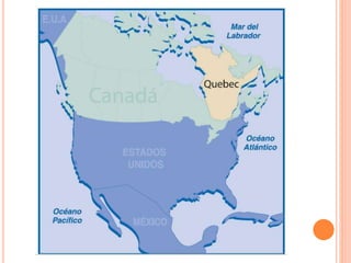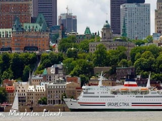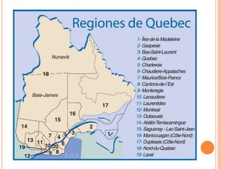 Este documento presenta varias opciones de transporte en la provincia de Quebec, Canadá. Incluye avión, barco, tren, autobús y automóvil para llegar a destinos como las Islas de la Madeleine, Nunavik, Montreal, Isla del Príncipe Eduardo y otras regiones como Laurentides y Montérégie, que ofrecen paisajes naturales, aventura, historia y cultura.