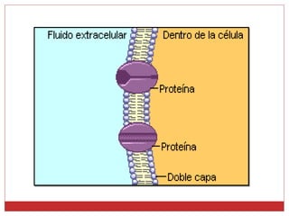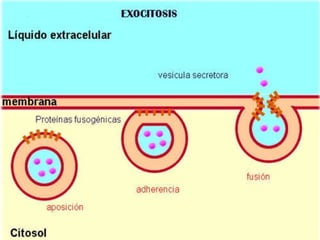 El documento resume los principales procesos de transporte a través de membranas celulares. Explica que el transporte pasivo como la difusión y la osmosis no requieren energía, mientras que el transporte activo como la bomba de sodio-potasio sí requiere energía del ATP. También describe los mecanismos de endocitosis y exocitosis para el transporte de moléculas grandes, y cómo las acuaporinas facilitan el paso del agua a través de membranas.