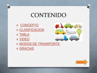 Este documento proporciona información sobre el concepto de transporte, su clasificación y los diferentes modos de transporte. Define el transporte como el traslado de personas o bienes de un lugar a otro. Explica que puede clasificarse por el tipo de viaje, elemento transportado o acceso, como transporte público versus privado. Finalmente, detalla los diferentes modos de transporte como caminar, bicicleta, automóvil, ferrocarril, transporte fluvial, marítimo y aéreo.