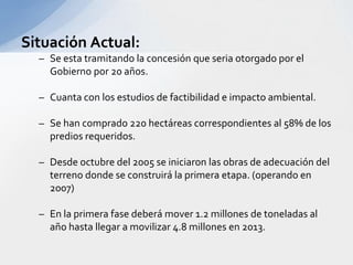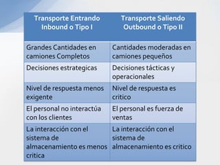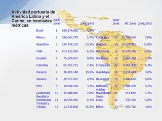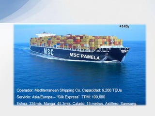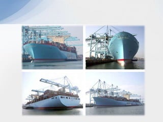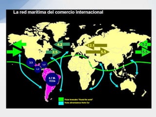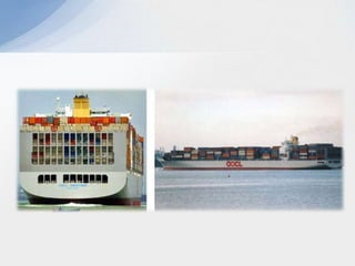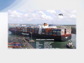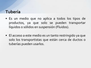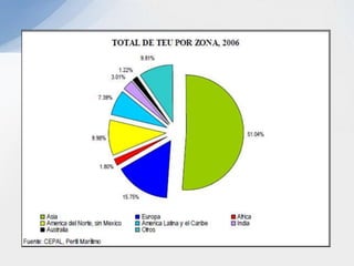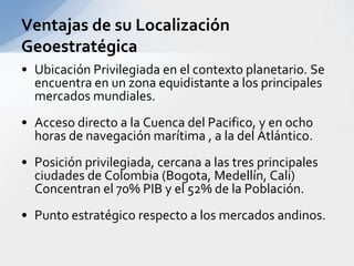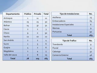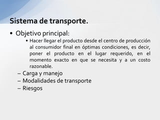 Este documento describe varios aspectos clave de los sistemas de transporte en Colombia. Explica los principales modos de transporte terrestre, marítimo y ferroviario, e identifica factores importantes a considerar en la selección del modo de transporte apropiado para diferentes tipos de productos. También resume la situación actual de varios puertos colombianos importantes como Cartagena, Barranquilla y Santa Marta, e introduce el proyecto del puerto de aguas profundas de Tribugá como una opción portuaria estratégica.