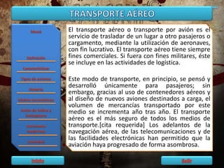 El documento describe el transporte aéreo como un servicio lucrativo para trasladar pasajeros y cargamento mediante aeronaves. Explica que inicialmente se enfocó en pasajeros pero ahora transporta más mercancías usando contenedores aéreos. También cubre las clasificaciones de aeronaves, los avances históricos del transporte aéreo comercial y algunos de los aviones más importantes.