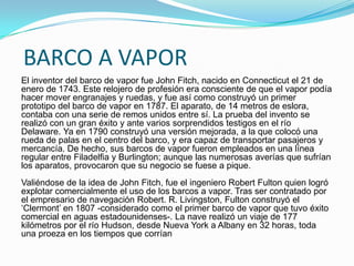 El documento describe la invención del barco de vapor. John Fitch construyó el primer prototipo exitoso en 1787 en el río Delaware. Aunque Fitch operó una línea regular de barcos de vapor, su negocio fracasó debido a averías frecuentes. Robert Fulton luego tuvo éxito comercial con el barco Clermont en 1807 en el río Hudson entre Nueva York y Albany.