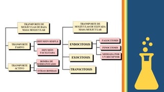 El documento describe los diferentes tipos de transporte de membrana que ocurren en las células, incluyendo el transporte pasivo por difusión simple, difusión facilitada y osmosis, y el transporte activo que requiere energía. Explica que el transporte pasivo permite el paso de sustancias a través de la membrana siguiendo gradientes de concentración, mientras que el transporte activo transporta sustancias contra gradientes usando energía. También menciona el transporte en masa para macromoléculas.