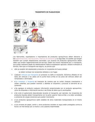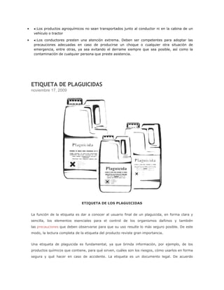 1) Los documentos describen las regulaciones para el transporte seguro de plaguicidas y la información requerida en las etiquetas de plaguicidas. 2) Las etiquetas deben incluir instrucciones sobre el uso adecuado, precauciones, equipo de protección requerido y advertencias de seguridad. 3) El equipo de protección como guantes, mascarillas y ropa protectora son necesarios para manipular plaguicidas de manera segura y prevenir la exposición a través de la piel o por inhalación.