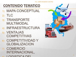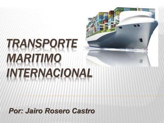 El documento abarca el transporte marítimo internacional, incluyendo su infraestructura, ventajas competitivas y modalidades, y destaca la importancia de los acuerdos de libre comercio para potenciar el comercio exterior. También detalla definiciones clave de buques y puertos, así como las características y clasificación del transporte marítimo, que es el más utilizado en el comercio global. Se analizan además aspectos relacionados con la logística y la intermodalidad en el transporte, enfatizando su rol en el desarrollo territorial y el comercio internacional.