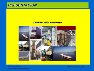 El documento presenta información sobre transporte marítimo internacional. Explica que el transporte marítimo es un aspecto importante en el comercio internacional y logística por su impacto en costos y riesgos. Describe los diferentes roles involucrados como agentes marítimos, armadores, transportistas, y consignatarios. También cubre temas como tipos de puertos, buques, contratación de fletes, conocimientos de embarque, y tendencias modernas como el uso creciente de contenedores.