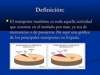 El transporte marítimo incluye el traslado de mercancías y pasajeros por mar. Los principales puertos españoles han experimentado un ligero aumento y estancamiento en el tráfico de pasajeros entre 1998 y 2005. Barcelona se ha convertido en el puerto más importante de Europa para los cruceros, recibiendo 14,000 turistas en un día de mayo de 2014, beneficiando a la hostelería local. MSC Cruceros es una importante empresa de cruceros fundada en 1987 que ha experimentado crecimiento a pesar de la recesión económica.