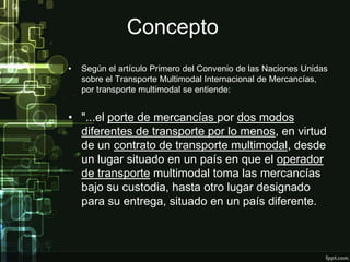 El documento describe el concepto de transporte multimodal, caracterizándolo como el transporte de mercancías a través de dos o más modos de transporte en virtud de un solo contrato de transporte. Explica que requiere unidades de carga intermodales como contenedores y que involucra a un operador de transporte multimodal que puede ser un transportista integral o uno que subcontrata parte del transporte. También cubre aspectos técnicos como documentos y marco jurídico.